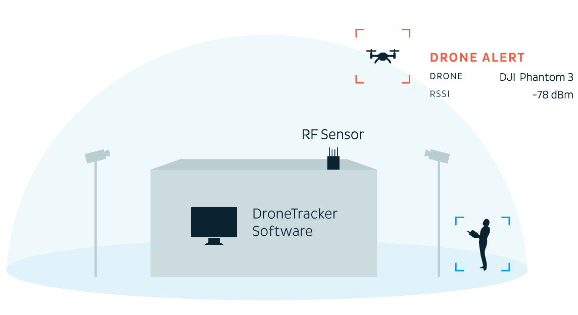 DroneTracker integra-se em vários sensores, incluindo RF-300, e fornece sites protegidos com segurança completa do espaço aéreo